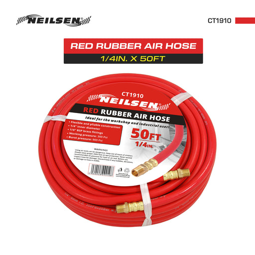 Neilsen1/4in. x 50ft Rubber Air HoseFlexible and Pliable Construction1/4in. BSP Brass FittingsWorking Pressure : 300 PSIBurst Pressure : 900 PSI
