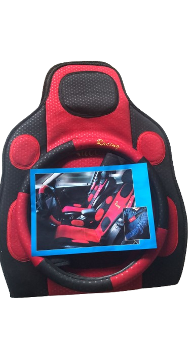 AR29424 - SEAT AND STEERING WHEEL COVER SET 5PC (WITH SEATBELT COMFORTER PADS) 'RACING' BLACK AND RED
