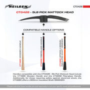Handles compatible with the CT0428 - 5lb Pick Mattock Head include the CT1985 Wooden Handle and the CT2258 Fiberglass Handle. Additionally, for those requiring safety against electrical shock, the CT0880 offers a 900mm Insulated Shaft (BS8020). Please note that these handles are sold separately to suit your specific needs and preferences.