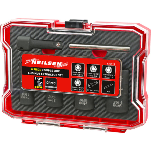 NeilsenIncludes:8pcs 1/2'' nut extractor:14mm, 16mm, 17mm, 19mm, 21mm, 22mm, 24mm, 27mm1pc Rod 1pc 1/2'' Dr adaptorDesigned for use with manual or impact ...