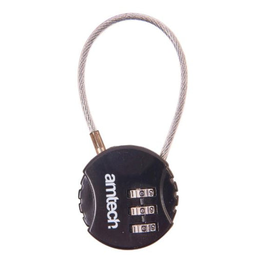 AmtechThis 3-digit combination lock has a 13cm flexible steel braided shackle wire and a powder coated zinc alloy body. It is perfect for securing suitca...