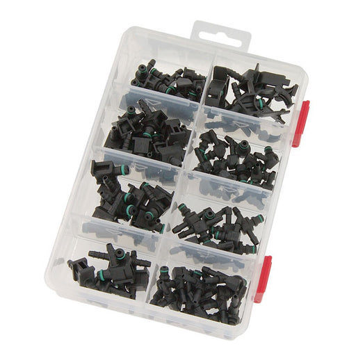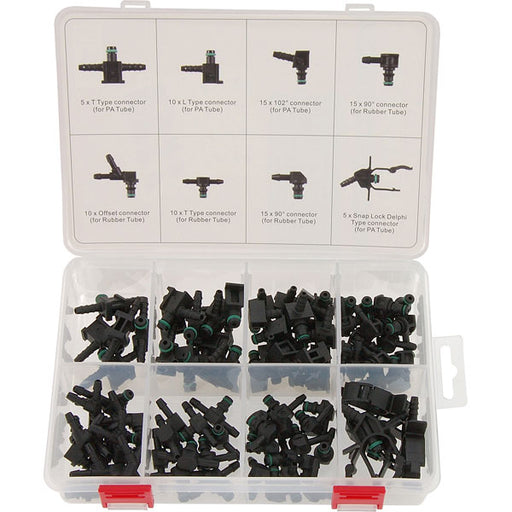 Neilsen85 piece kit containing a selection of 'T' type, 'L' Type, Offset, Angled (90° & 102°) & Snap Lock (Delphi) connectors, complete with FKM o...