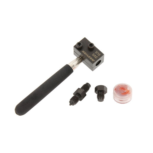 The set includes dies and punches for the two most common brake pipe sizes: 4.75mm and 3/16 diameter and can produce SAE double flares.