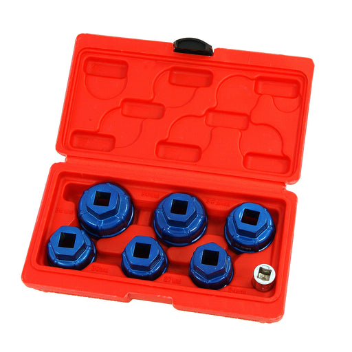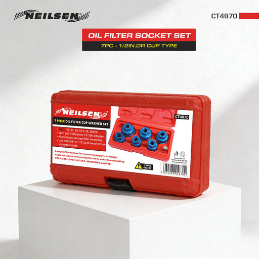 Neilsen7pc Oil Filter Socket Set - 1/2in.Dr Cup TypeSizes : 24 | 27 | 30 | 32.5 | 36 | 38mmwith 3/8in.F Drive to 1/2in.M AdaptorLow profile design for rem...