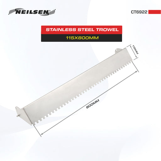 NeilsenPlastering TrowelBlade size : 280 x 125mmStainless Steel with Serrated EdgesBanana Cushion Grip HandleFor all plastering and floor screeding jobs T...