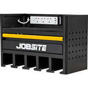 This wall-mounted rack holds up to 5 power tools. It features a smooth powder-coated finish and open front bays for easy access to your tools. The top also has an anti-slip mat for secure placement of chargers. The built-in power strip has 3 UK sockets (100-250V~), 1 USB-Type C, and 2 USB ports. The side panel is made of heavy gauge steel and has a square hole (10x10mm) for hanging hooks. The rack also includes open ball-bearing drawer slides for storing smaller items and tool accessories.