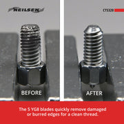 The 5 YG8 blades quickly remove damaged or burred edges for a clean thread.